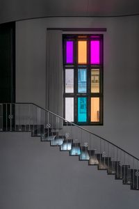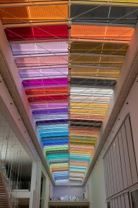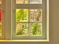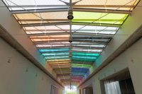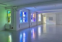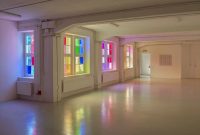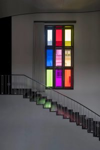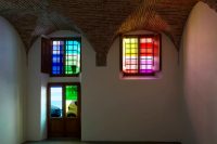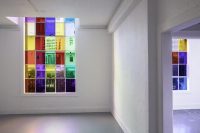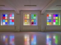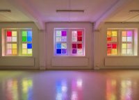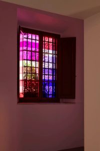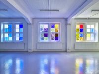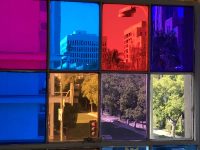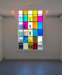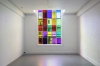 For Film she works with cinema lighting gels, which come in manufactured sets in a range of colors and tones and typically serve to adjust the color temperature of a given scene. Identical in size, the gels function as film frames, and each window frame forms a reel of film. Instead of a projector, the sun provides light while visitors lend motion to the work, frame by frame, as they pass through the space. Moviegoers typically sit still, in the dark, and watch a single film from beginning to end. Here, the viewers are instead in motion, the space itself is full of light, and the films can be viewed more or less at once—forwards or backwards. The full duration of the installation functions as an extended single screening, open-ended and unrepeatable.