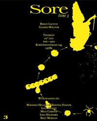 Sore is a serial anthology that brings together authors whose writing practices oscillate between the genres of diary keeping and fiction. For the second issue of Sore, ten contributors – both authors and visual artists – were invited to collectively develop their work through a series of informal critiques over the course of five months.