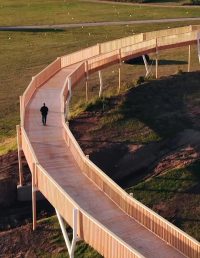 With the installation The Long Way Around at Roskilde Festoival, Jesse Darling transforms the hill near the dancefloor into a large-scale circular installation that spirals up to a viewing and meeting point at the hill's summit. He challenges the festivalgoer's conventions of what is considered possible and normal – a challenge that exists both in our imagination and as a concrete, real-world practice. The installation looks like an oversized wheelchair ramp and is designed to be accessible. The artwork makes it easier for wheelchair users to reach the top and offers "a long way around" for others seeking access to the top of the hill—an alternative, slow, and sensuous route to the summit.