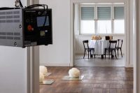 As early as 1971, Raspé developed the so-called ‘camera helmet’ before these were industrially available: a construction site helmet equipped with a Super 8 camera that captures the central perspective of the artist’s gaze and enabled her to film her everyday life. The resulting films show the artist performing routine tasks, including housework, which are usually executed rather unthinkingly, or automatically. Raspé’s hands can be seen in clinical detail, whipping cream into butter in Der Sadist schlägt das eindeutig Unschuldige, 1971, baking a cake in Backe Backe, Kuchen, 1973, or washing up in Alle Tage wieder – let them swing!, 1974. Besides lending visibility to often invisible, ordinary chores, the films also bear witness to the mostly unconscious physical processes at work. These automated actions are sometimes violent in the way they transform their matter, but equally remain banal. The automatic is examined as a process that takes place between cerebral and manual work. The body is considered as a programmable ‘Mensch-Maschine’ (human machine) or as a ‘Frautomat’ (female robot), to which the camera helmet acts as a prosthetic extension and enables the viewer to experience the artist’s own perspective, universally mirrored.