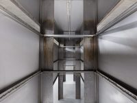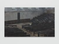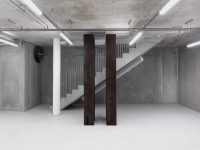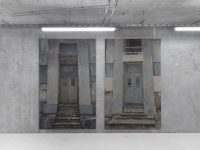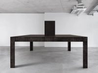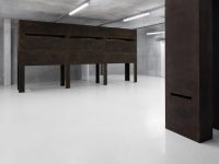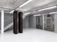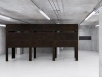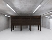 Bisecting the basement is a long, tall sculpture which resembles an enclosed storage rack. Visitors can crawl under its sides and enter a narrow internal corridor illuminated only by a thin horizontal slit above eye level. Here de Carvalho attempts to find sculptural form for Malabou’s concept of ‘destructive plasticity’: the ability of the brain not only to change but to transform completely after traumatic incidents, of a nascent identity to supplant an old one. The structure is formed from modular units inspired by wooden panels in a classroom, so its manufacture (creating something new, futile and blank out of something familiar and wholly distinct) mirrors the idea of transformation through loss, of creativity as a destructive act.