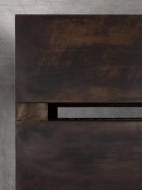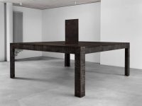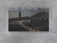 Like Malabou’s note, de Carvalho’s art is ambivalent about the production and dissemination of knowledge. The lecture hall in the painting by the entrance is empty, full of pedagogical potential but also as derelict and dilapidated as the scene of a violent crime (a long way from Niolon). And the steel sculptures look in shape and patina like pieces of laboratory furniture but are rendered useless, even hostile, by de Carvalho’s design. This equivocal tone befits Malabou’s belief in the possibility of total rupture: revolution is, after all, both salvation and murder.