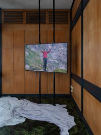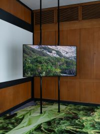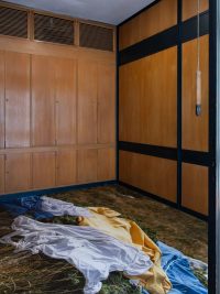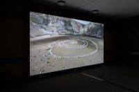 In the corner rooms, Afsah stages a series of installations that echo the circular pattern of Paneurhythmy. Three additional screens play short scenes on a loop, tracing the sun’s rise and fall to mark the three stages of the ritual. Enlarged photographs of scattered clothing cover the floor, captured during the filming of PAN. They recall the moments when participants changed their clothes before and after the ritual, leaving them in the bushes or on the ground. The artist is as drawn to these in-between moments—of waiting, preparation, and rest—as she is to the ritual itself. The discarded garments, left just outside the circles, inhabit a place both beneath and beyond the performed homogeneity. Quietly, they are a reminder of what is set aside—the different and the incongruent—in the spiritual pursuit of wholeness and harmony with the natural world.